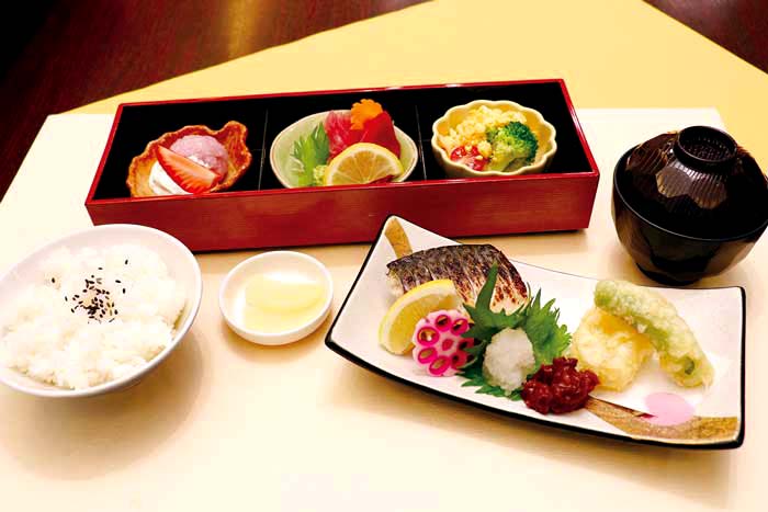・鯖の塩焼き ・大根天ぷら ・お造り ・ポテサラ ・味噌汁 ・ご飯 ・漬物 ・デザート(ミニ桜餅)