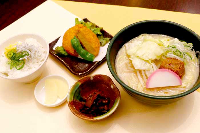 ・春キャベツと鶏そぼろの白湯ラーメン ・桜エビクリームコロッケ ・小鉢 ・味噌汁 ・釜揚げシラスご飯 ・漬物