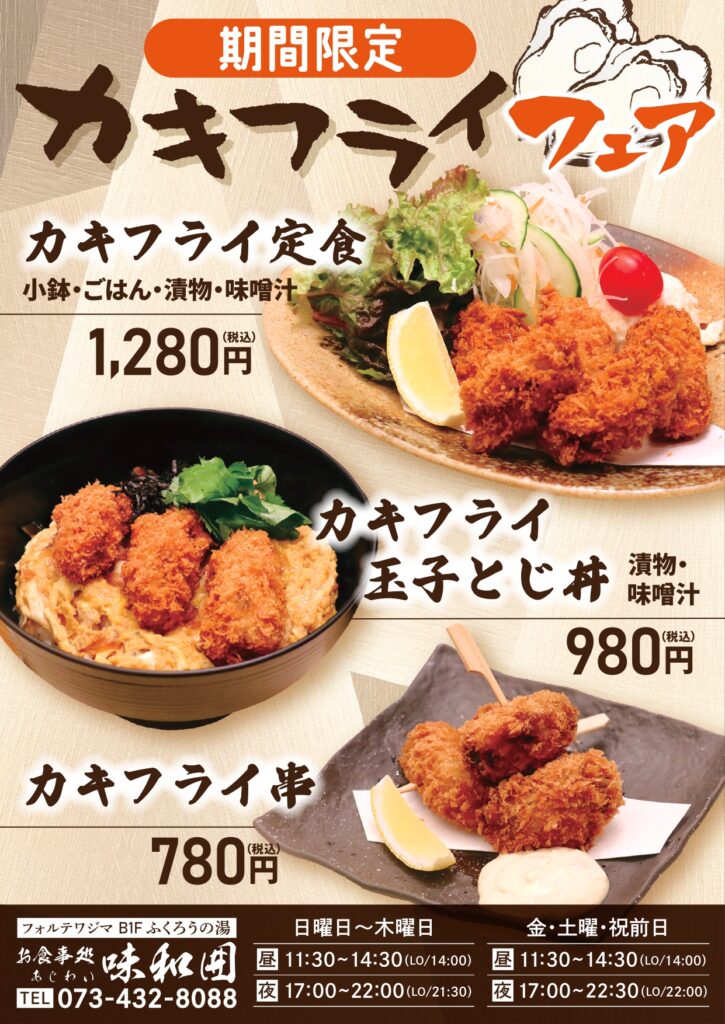 | 開催期間: 12月1日(月)~4月25日(土) | 内容:◆味和囲 限定特別メニュー カキフライフェアー◆ |