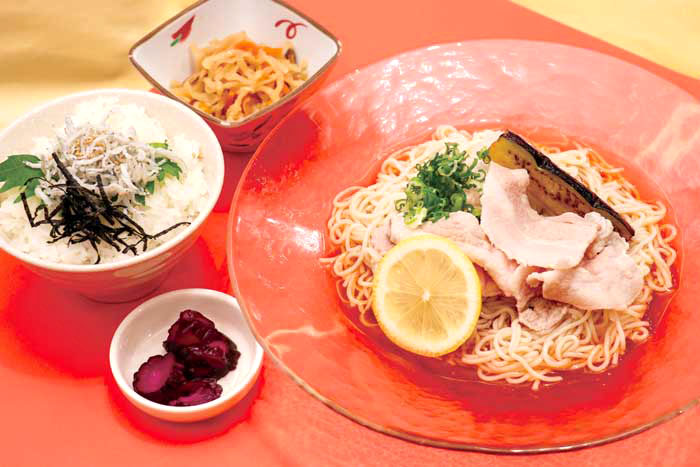 ・豚バラ冷しゃぶ ぶっかけ素麺 ・釜揚げしらすご飯 ・小鉢 ・漬物