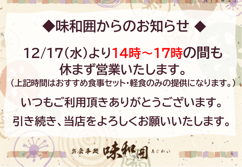 | 開催期間: 12月17日(水)~12月31日(水) | 内容:お食事処 味和囲より【お詫び】 |