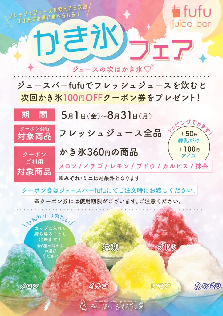 ジュースバーfufuでフレッシュジュースを飲むと、次回かき氷🍧100円OFFクーポン券をプレゼント!