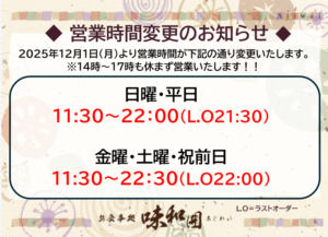 〈金曜・土曜・祝前日〉11時30分~14時30分(オーダーストップ 14時)